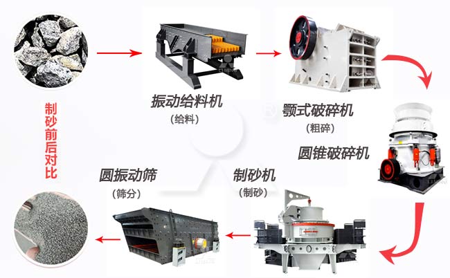 河卵石制砂工藝:將破碎后的河卵石送入制砂機(jī)進(jìn)行進(jìn)一步破碎整形,如需潔凈的河卵石,可送入洗砂機(jī)清洗。