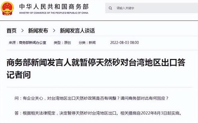佩洛西竄訪中國臺灣地區(qū),后續(xù)8月3號開始實(shí)施暫停天然砂對臺灣地區(qū)出口,一時(shí)間成為公眾高度熱議的話題,那么什么是天然砂?天然砂有什么作用?暫停天然砂對臺灣出口相關(guān)措施會有什么影響?