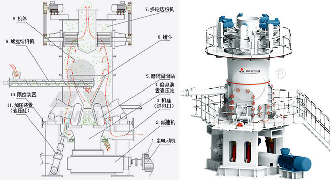 LUM超細(xì)立磨主電機(jī)通過減速機(jī)帶動磨盤轉(zhuǎn)動,同時風(fēng)從進(jìn)風(fēng)口進(jìn)入磨機(jī),物料經(jīng)螺旋給料機(jī)下料口落在磨盤中央,在離心力的作用下,物料從磨盤中央向邊緣均勻移動,經(jīng)過磨盤上的粉磨輥道區(qū)域時,受到磨輥的碾壓,大塊物料直接被壓碎,細(xì)粒物料受擠壓后形成料床進(jìn)行粒間粉碎。被粉碎的物料繼續(xù)向磨盤邊緣移動,直到被風(fēng)環(huán)處的強(qiáng)氣流帶走,而較大的顆粒物料又重新掉落到磨盤上繼續(xù)粉碎,氣流中的物料經(jīng)過上部的分離器時,在轉(zhuǎn)子葉片的作用下,粗顆粒重新回到磨盤上粉磨,合格的細(xì)粉隨氣流一起出磨,被系統(tǒng)的集粉器收集,被收集到的粉料即為超細(xì)立磨磨出的產(chǎn)品。
